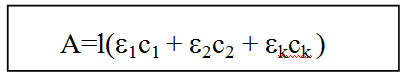 Где e - молярный коэффициент поглощения, l – толщина светопоглощающего слоя, с – концентрация раствора Физический смысл молярного коэффициента поглощения сразу становится ясным, если мы принимаем с = 1 моль/л и l = 1 см. Тогда А= e. Следовательно, молярный коэффициент поглощения равен оптической плотности одномолярного раствора при толщиние слоя 1 см. Оптическая плотность раствора, содержащего несколько окрашеных веществ, обладает свойством аддитивности, которое называют свойством аддитивности светопоглощения. В соответствии с этим законом поглощение света каким-либо веществом не зависит от присутствия в растворе других веществ. При наличи окрашеных веществ в растворе каждое из них будет давать свой аддтивный вклад в экспериментально определяемую оптическую плотность. Т.е. мы получаем: